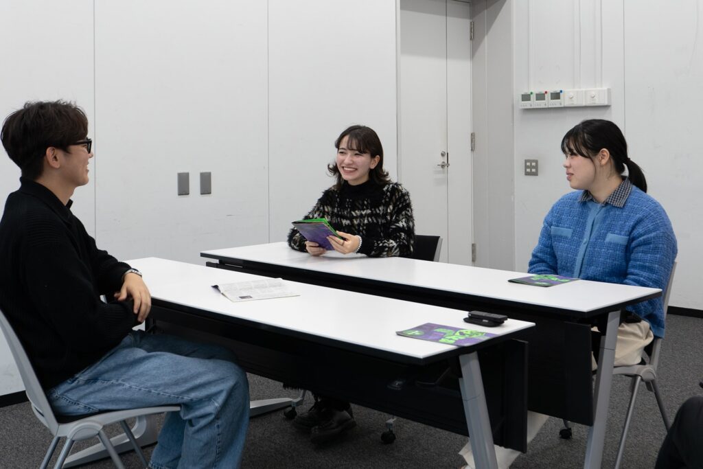 ふりかえりインタビューに協力してくれたのは、リーダーを務めたスコット愛真ルイーズさん(視覚伝達デザイン学科3年)と、メンバーの古市真之介さん(芸術文化学科3年)、津田幹乃さん(映像学科2年)の3名です。