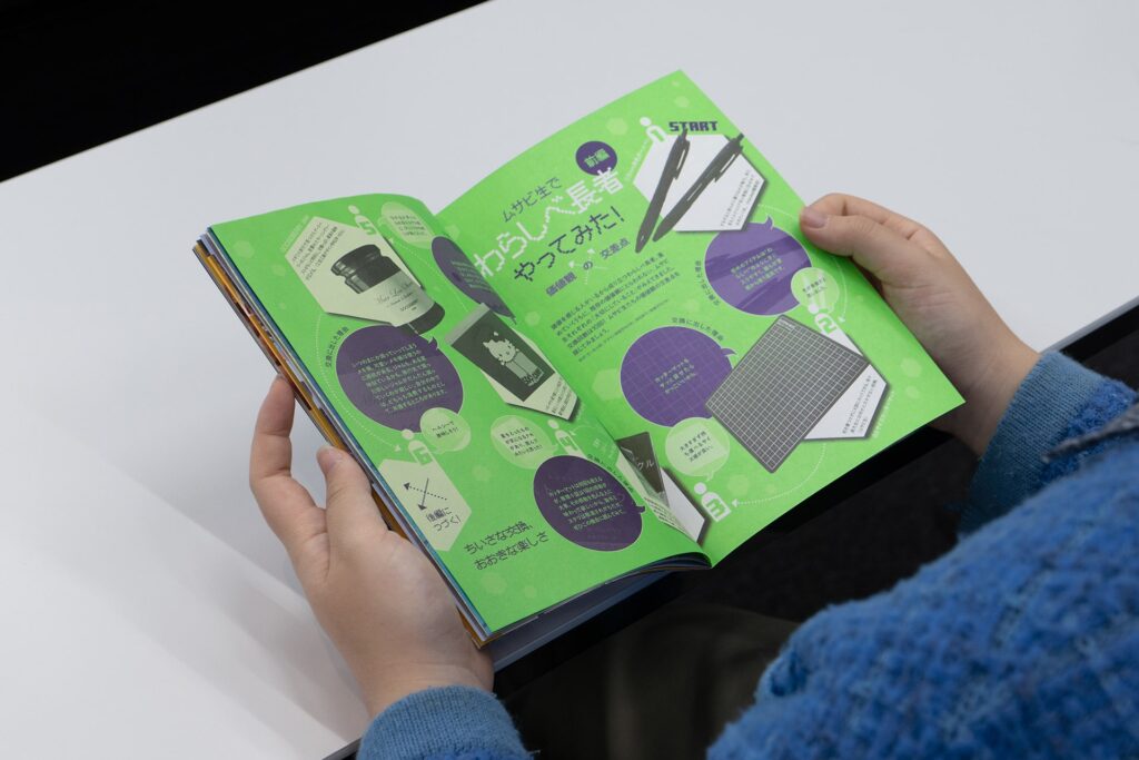 古市:完成するまではデジタルのデータでしか見ていなかったので、冊子というかたちで実際に手に取ったときは「おお〜!」と思いました。充実感がありましたね。芸術文化学科では、普段の課題は企画やワークショップなど「コト」を扱うものが多いので、僕も自分たちでつくった「モノ」を手にする満足感を味わうことができました。